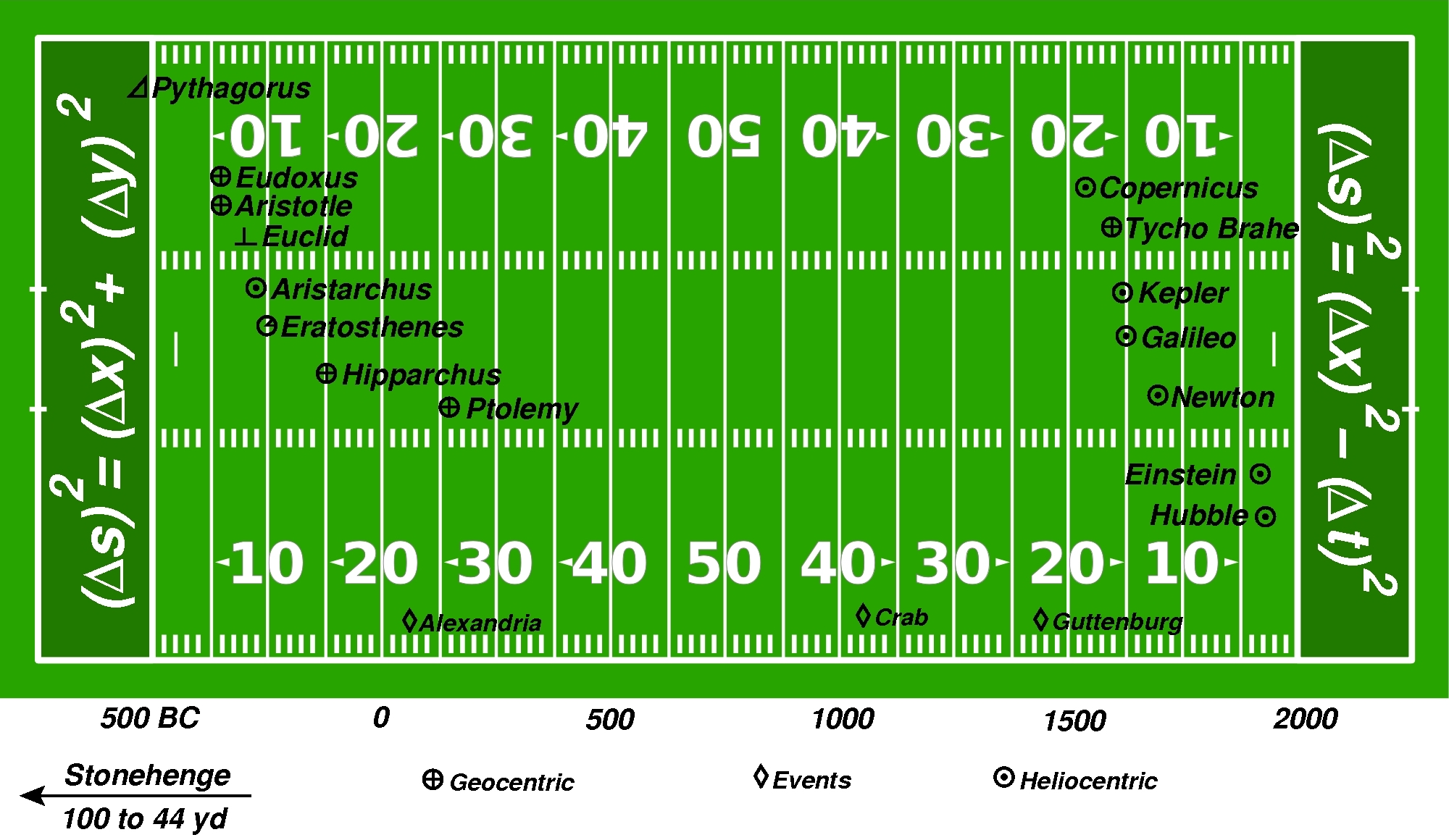 You can locate any historical event with the simple formula L = (y+500)/25 where y is the date of the event in years (positive for AD, negative for BC), while L is the number of yards from the left side goal line.
