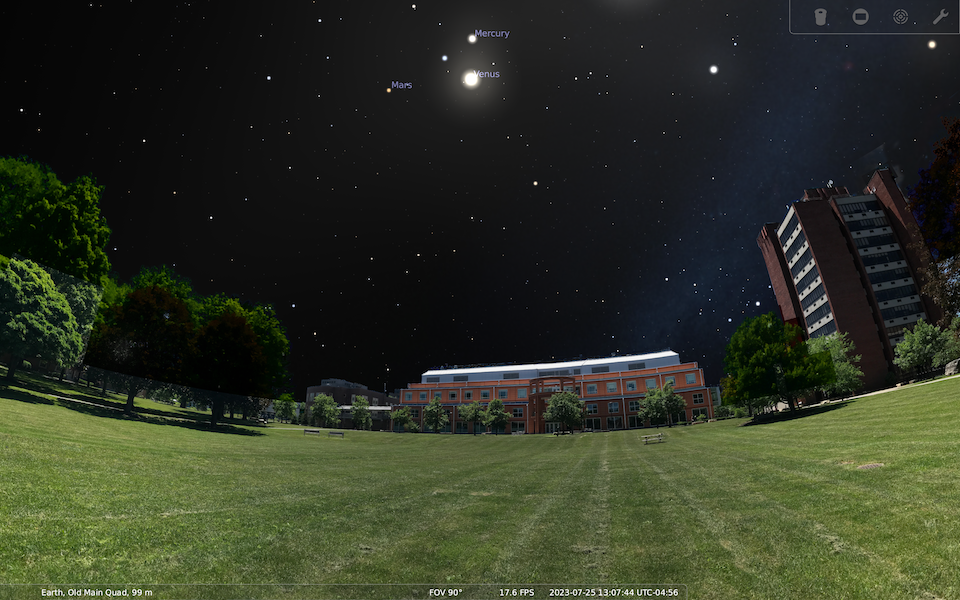 Stellarium is software which can show you the night sky at any time from any place on the surface of the Earth (and even some planets). It's used in the John R. Kirk Planetarium at SUNY New Paltz, and in other planetariums around the world, but you can also run it on your own computer. It is a free download for Windows, Mac, and Linux. You can get Stellarium from https://stellarium.org.