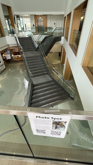 A project is in progress to try to record an image of the staircase every day at solar noon (when the weather allows). We will then put these together into a time-lapse video of the light from the skylight going up and down the stairs. You can help by taking a picture from the spot marked on the upstairs railing (see the photo) as close to solar noon as possible.