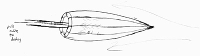 In the diagram the ends of the linkage are connected to the blob at the left marked "Drag Device", which I imagine could either be a parachute made of kevlar, designed to fill the entire pipe cross-section, or an umbrella framework fitted with kevlar cloth. I can see benefits of both alternatives, but the main point is that it's something that spreads out to cover the entire cross section of the pipe, and it's connected to the lever arms so as to drive the feet into the wall of the pipe to anchor the whole thing in place.